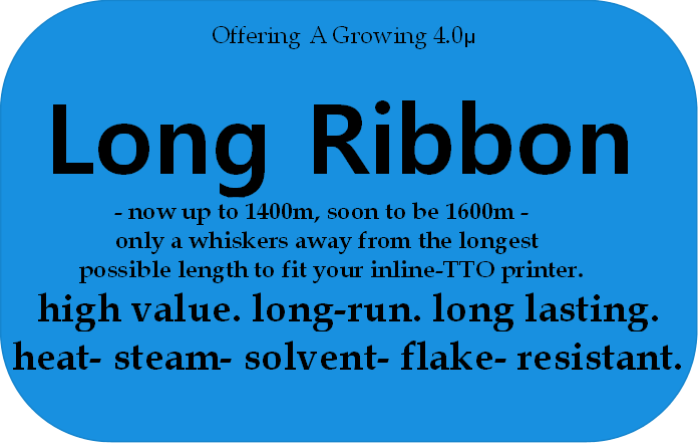 - Ribbon widths 25mm - 130mm, and lengths of 300m, 450m, 600m, 650m, 750m, 850m,900m, 1000m, 1100,